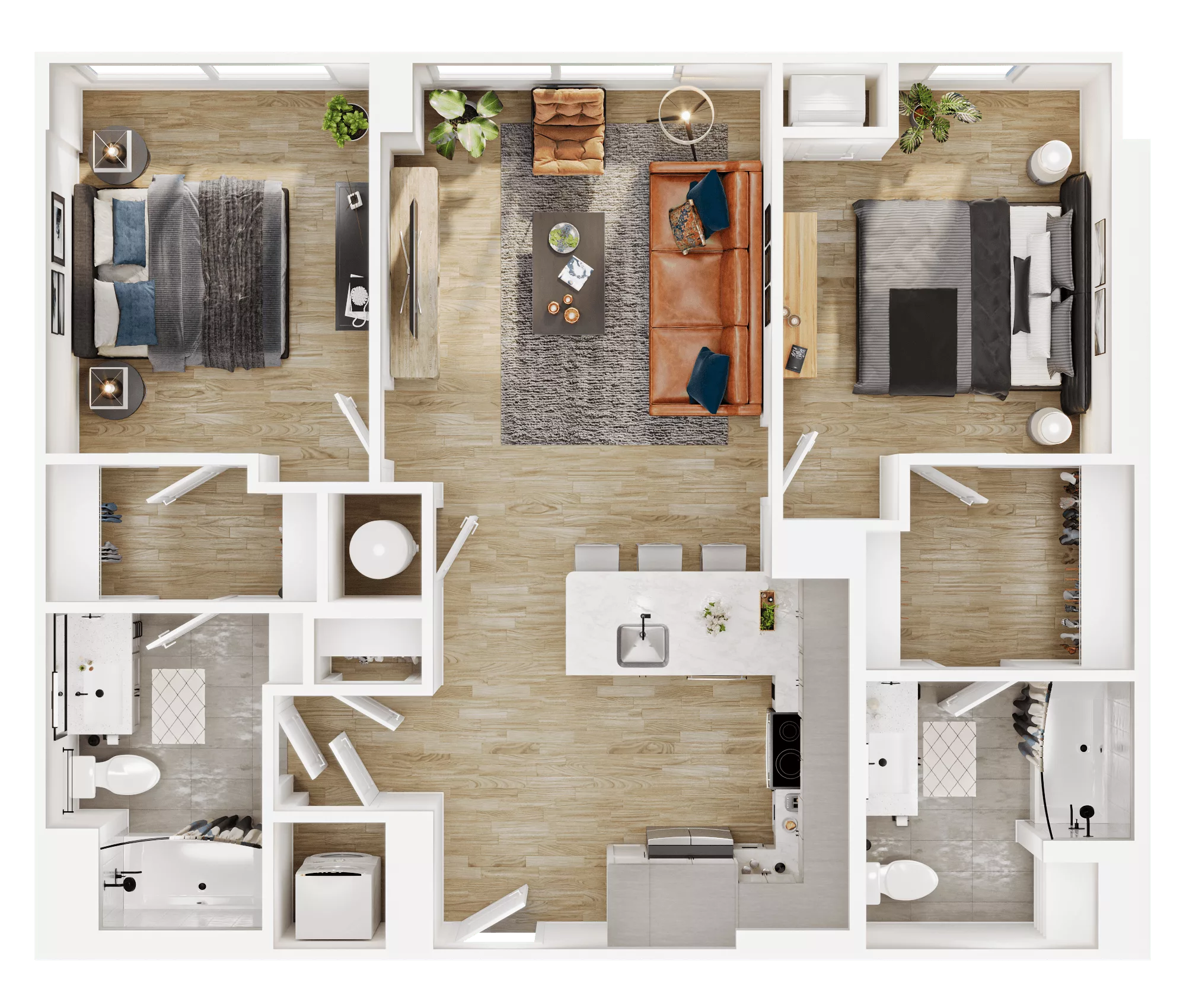 Rendering of the B7 floor plan with 2 bedroom[s] and 2 bathroom[s] at Vermeer